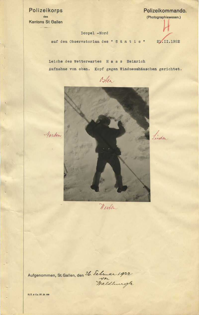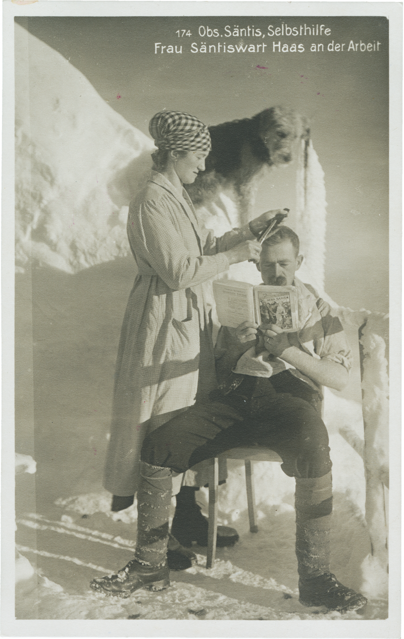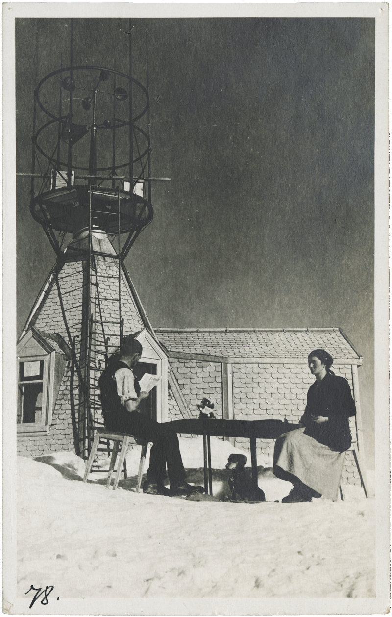Atop the SĂ€ntis mountain, 3,000 meters above sea level, the married couple Heinrich and Magdalena Haas lived and worked in a small weather station. Every day, they transmitted their weather observations via telegraph down into the valleyâuntil one day, the line went silent. Magdalena Haas was found in the devastated kitchen; Heinrich Haas was discovered farther down the slope, lying face-down in the snow. A rival had brought their shared life to an end. Archival photographs offer a glimpse into the intimate atmosphere of their togethernessâa sparse life framed by immense geological beauty.
